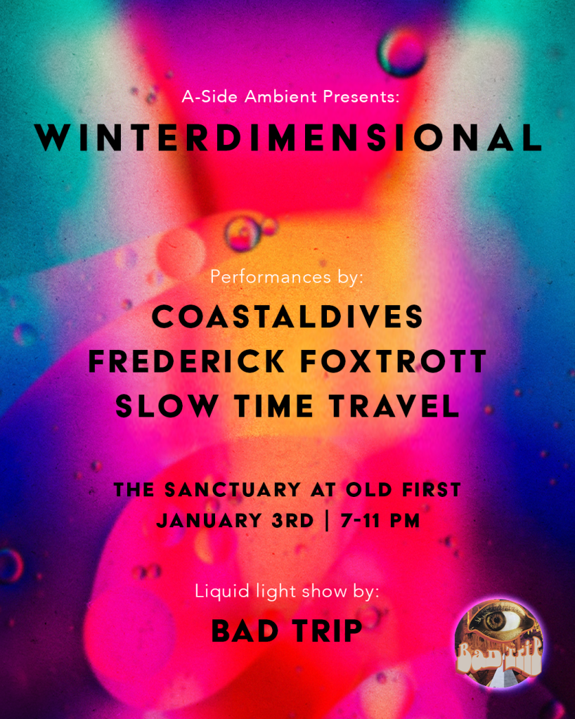 A-Side Ambient presents WINTERDIMENSIONAL: an evening of ambient electronic warmth, featuring performances by CoastalDives, Frederick Foxtrott, and Slow Time Travel. Liquid light by Bad Trip Show in the reverberating space of the sanctuary at Old First (1101 Bryden Rd). TICKETS HERE.