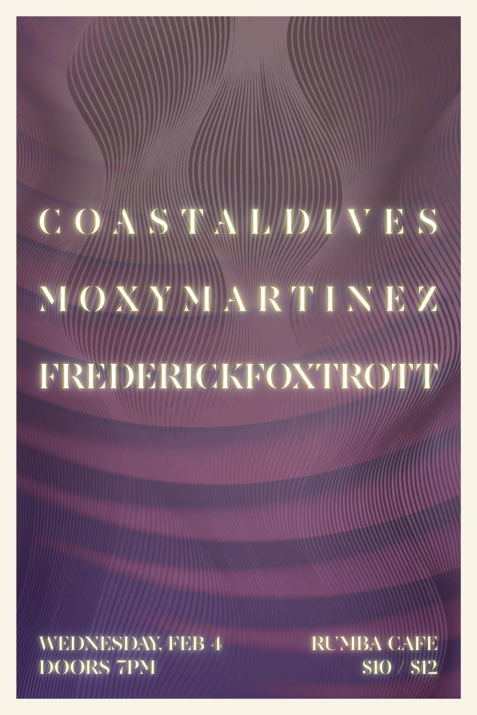 An evening of expansive electronic music. Very excited to invite you to a night of analog synthesis by CoastalDives / Moxy Martinez / Frederick Foxtrott. Wednesday, Feb. 4 at Rumba Cafe, doors at 7pm. Tickets available at Used Kids, Magnolia Thuderpussy, and Rumba Cafe. $10 presale, $12 at the door.